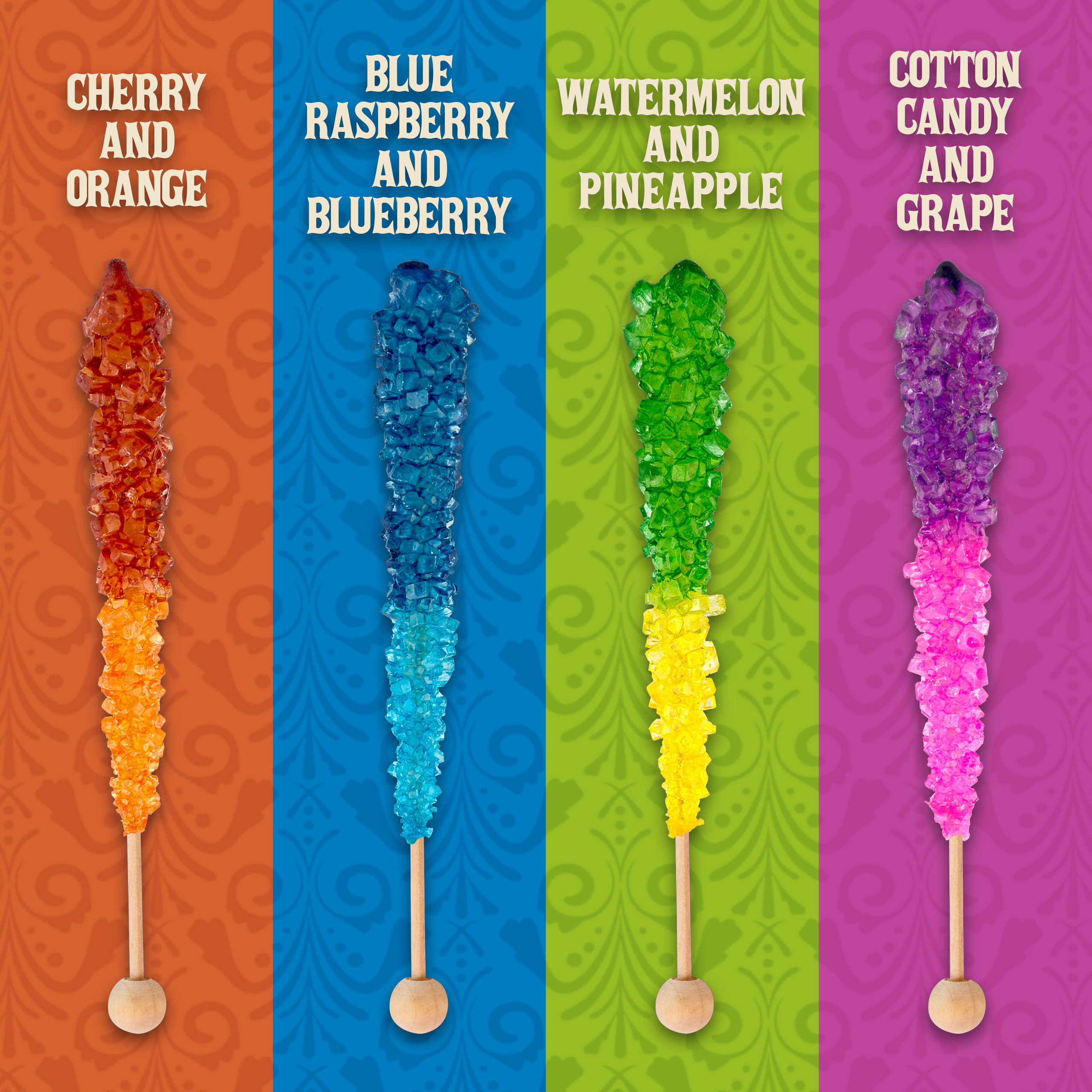 Flavors include: orange & cherry, blueberry & blue raspberry, pineapple & watermelon, and cotton candy & grape.